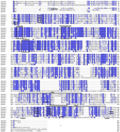 Cloned cDNAs of the SaCLCa2 and SaCLCc2 genes contained open reading frames (ORFs) encoding polypeptides consisting of 800 and 708 amino acids, with calculated molecular masses of 88.2 and 77.5 kDa, respectively. Amino acid sequences of the SaCLCa2 and SaCLCc2 were aligned with those of other SaCLC proteins revealed by us previously [31,32,33]. The SaCLCa2 protein is comparable in size with SaCLCa1 (811 a.a.), SaCLCc1 (791 a.a.), SaCLCd (793 a.a.), and SaCLCg (776 a.a.) (Figure 1), as well with AtCLCa (775 a.a.), AtCLCb (780 a.a.) [36], and a protein encoded by a sequence found in S. fruticosa transcriptome, SfCLCa2 (800 a.a.) (Figure S1a). The other protein identified in S. altissima, SaCLCc2, is smaller than the above mentioned SaCLCs and its homolog AtCLCc (779 a.a.), but SaCLCc2 is longer than a short isoform of SaCLCf (586 a.a.) (Figure 1 and Figure S1b). The shortened isoforms of CLC proteins have been found in transcriptomes of other plants: Olea europaea subsp. europaea (CAA 2963713.1), Olea europaea var. sylvestris (XP_022861637.1), Phoenix dactylifera (XP_038975861.1), Citrus clementina (XP_006431490.1), Vitis vinifera (XP_010657886.1), Handroanthus impetiginosus (PIN10391.1), Eucalyptus grandis (XP 010030224.1) (Figure S2). Shortening always occurred at the N-terminus of the proteins.