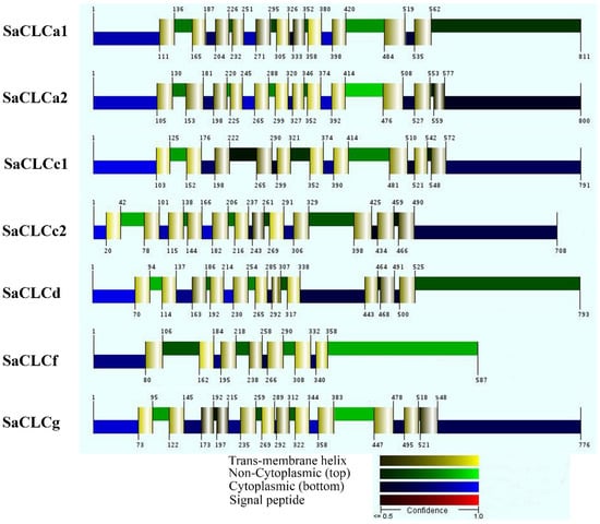 Membrane topology of SaCLC proteins predicted by Philius software (version 3.0, https://noble.gs.washington.edu/proj/philius/; accessed on 15 December 2022).