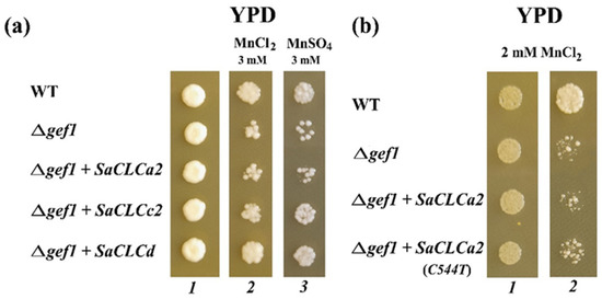 Growth of the yeast mutant Δgef1, transformed with SaCLCa2, SaCLCc2 and SaCLCd genes. Controls: wild type W3031A and the mutant Δgef1 transformed with vector pMB1. Approximately 105 cells were placed and grown on selective media. Growth media for (a): lane 1—YPD; 2—YPD + 3 mM MnCl2; 3—YPD + 3 mM MnSO4; Growth media for (b): 1—YPD; 2—YPD + 2 mM MnCl2; The duration of growth was 3 (a) and 2 (b) days.