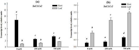 To gain an insight into the physiological roles of SaCLCa2 and SaCLCc2 proteins, the effect of salinity on the expression of genes encoding these proteins in S. altissima organs was studied. The relative abundance of SaCLCa2 and SaCLCc2 transcripts were measured in roots and leaves of 45-day old plants grown on nutrient solution (NS) of Robinson and Downton (1985) [47] without NaCl or containing additionally NaCl in concentrations of 250 or 750 mM (Figure 4a,b). Plants grown without NaCl were characterized by a relatively high level of SaCLCa2 transcripts in roots and the level was approximately an order of magnitude lower in leaves. The presence of NaCl led to a substantial decrease of SaCLCa2 transcript abundance in roots and to a slight increase of that in leaves. In the absence of NaCl, the level of SaCLCc2 expression in roots was more than an order lower in comparison with that of SaCLCa2 in this organ, whereas in leaves, under control conditions, expression levels of the two genes were comparable. Under salinity, transcript abundance of SaCLCc2 increased in both organs, but in roots remained at considerably lower levels than in leaves.