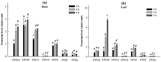 The expression of SaCLCa2 and SaCLCc2 as well of other genes of the S. altissima CLC family [31,32,33] over time was also studied, at 0, 6, and 9 h after NaCl addition in the final concentration of 250 mM to NS of plants grown in the absence of NaCl (Figure 5a,b). In general, SaCLCa1, SaCLCa2, SaCLCc1, and SaCLCd showed relatively high expression activities in both roots and leaves. SaCLCf and SaCLCg displayed lower expression activities in these organs. The lowest expression activity was observed for SaCLCc2. Expression of S. altissima CLC genes demonstrated the ability to be induced by salt shock. In 6 and 9 h after addition of NaCl to NS, expression of SaCLCa2, SaCLCc1, SaCLCd, and SaCLCf increased in leaves and the expression of SaCLCa1, SaCLCc1, and SaCLCg increased in roots.