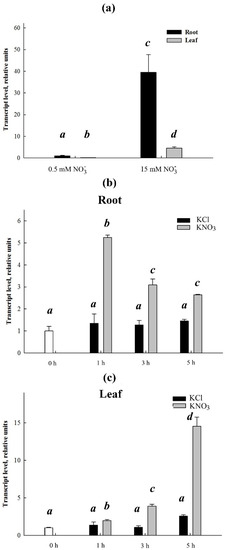 The impact of NO3– availability on transcript abundance of SaCLCa2 (Figure 6), the gene characterized by high expression activity, was also studied. The 45-day old S. altissima plants were grown on the nutrient NS of Robinson and Downton (1985) [47] with the standard NO3– concentration of 15 mM, or on the same NS but with the NO3– concentration lowered to 0.5 mM by replacing a relevant portion of nitrate with chloride. The SaCLCa2 expression in roots and leaves was found to be considerably lower in plants grown under nitrate deficit than at a sufficient supply of nitrate (40 and 50 times, respectively) (Figure 6a). Addition of KNO3 at the final concentration of 5 mM to the NS of plants grown under nitrate deficit (0.5 mM) resulted in considerable expression induction of SaCLCa2 in both organs with time maxima in 1 h in roots (Figure 6b) and 5 h in leaves (Figure 6c). Addition of 5 mM KCl instead of 5 mM KNO3 to the NS did not induce the expression of SaCLCa2.