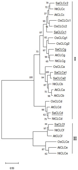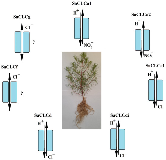 Taking into account the data obtained earlier [31,32,33], altogether 7 representatives of CLC family in the halophyte S. altissima (Table 1)—which corresponds to 7 full size or partial CDSs found in silico in transcriptomes of a close related species S. fruticosa [31,35]—are identified by us. Two of the identified proteins, SaCLCa1 and SaCLCa2, are likely to be NO3−/H+ antiporters, while the other proteins are likely to be Cl−/H+ antiporters (SaCLCc1, SaCLCc2, SaCLCd) or chloride channels (SaCLCf, SaCLCg).