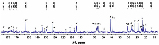 - Sheveleva, N.N.; Markelov, D.A.; Vovk, M.A.; Mikhailova, M.E.; Tarasenko, I.I.; Neelov, I.M.; Lähderanta, E. NMR studies of excluded volume interactions in peptide dendrimers. Sci. Rep. 2018, 8, 8916. [Google Scholar] [CrossRef]