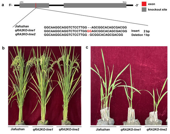 | qRA2KO-line2 | gRNAs | GGCAAGGCAGGTCTCCTTGG----GCGGCACAGCGACGG (Deletion 1 bp) |