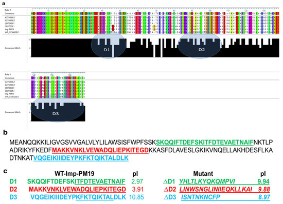 Amino acid sequence alignment of Imp-PM19 of different ‘Ca. P. mali’strains. (a) Amino acid sequences of Imp obtained from Gene Bank were aligned using DNA star program. Color letter indicate conserved amino acids. The grey shaded area (circled) in consensus math indicates the conserved regions. (b) Protein sequence of Imp-PM19 and (c) mutants. Green, Red and Blue labeled are D1-D3 conserved regions and their pI which were mutated (underlined letters) to generate ΔD1-∆D3-Imp-PM19-mutants (italic and underlined letters), respectively.