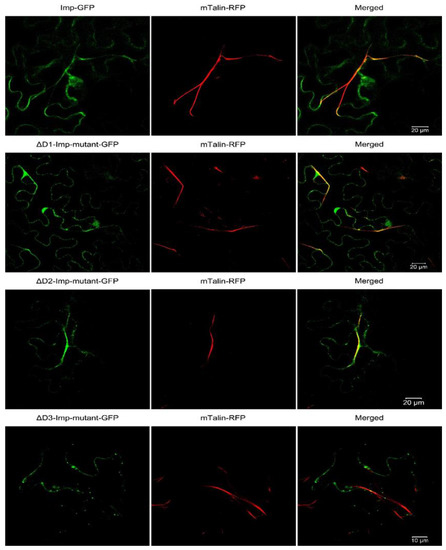 To identify an actin-binding region of Imp-PM19, we generated Imp-PM19 mutants (ΔD1-∆D3), as shown in Figure 1c. The aa of conserved regions were randomly mutated to change the total net charge of the regions. The Imp-PM19 and ΔD1-∆D3-Imp-PM19-mutants were transiently expressed as GFP fusion proteins in N. benthamiana plants via agrobacterium infiltration. The expression and localization of Imp-PM19 and the Imp-PM19 mutants were visualized with a confocal microscope by comparison with the localization of an actin-binding protein (mTalin) fused with red fluorescence protein (RFP), mTalin-RFP. The result of the localization of Imp-PM19 indicated that Imp-PM19 and ΔD1 and ΔD2-Imp-PM19 mutants (Figure 2) bound to N. benthamiana actin, while the ∆D3-Imp-PM19-mutant was dispersed within the cytoplasm. This suggests that the amino acid cluster is located in the C-terminal part of Imp-PM19 (D3) is the actin-binding region.