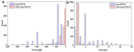 The results in Figure 6 show that the interaction force of the Imp-PM19 with the F-actinrabbit filament occurs between 40 and 400 pN, with a most frequently observed adhesion around 80–90 pN, whereas the ∆D3-Imp-PM19 mutant interaction is observed between 0–60 pN, with a most frequently observed adhesion force around 0–10 pN. In addition, the maximal work of adhesion by Imp-PM19 occurs between 4.5 and 5 aJ and by ∆D3-Imp-PM19 mutant at 1–2 aJ, suggesting that more work is needed to separate the Imp-PM19 from the Imp-PM19-F-actinrabbit filament complex. “Higher values of the work of adhesion” could also mean that Imp-PM19 is specifically tied to the F-actinrabbit filament or maybe the Imp-PM19 interacts more with the F-actinrabbit filament than the ∆D3-Imp-PM19 mutant. Thus, the results of SMFS analysis strongly support the results of the molecular analysis.