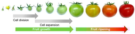 Main stages of tomato (Solanum lycopersicum L.) fruit development, exemplifying the two main phases of fruit growth (cell division and cell expansion) followed by the initiation and progression of ripening.