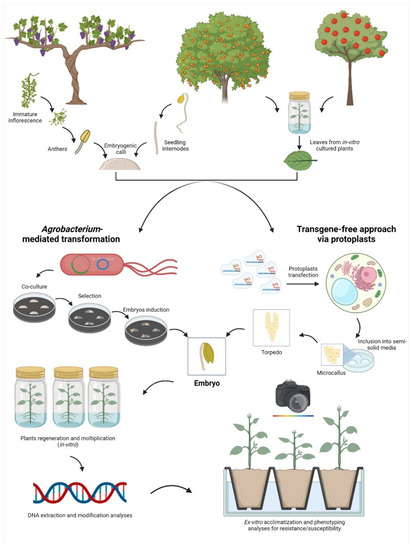 Representation of the main workflows exploited for the application of the new genomic techniques (NGTs) in some fruit crops selected as an example using somatic embryos. From left to right: in grapevine, the most exploited tissues to produce embryogenic calli belong to flowers (e.g., anthers and ovaries); in Citrus, hypocotyls are exploited to obtain embryogenic calli; in apple, there is no need for embryogenic calli since, if cultured in specific conditions, the leaf cells are able to regenerate the entire plant via organogenesis. Once the morphogenic competent tissue is obtained, there are two main approaches to apply NGTs: the classical method through Agrobacterium-mediated transformation or the isolation and transfection of protoplasts (DNA-free approach). Once the transformation/transfection event is completed, embryos are regenerated, and the genetic and phenotypic analyses are then performed.