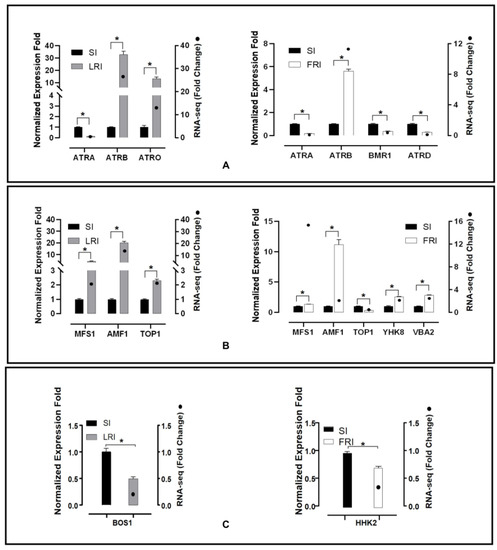 | Bcin 01g01450 | BcATRO | −1.6963 | - | - | 3.6815 | - | - | −1.5275 | |