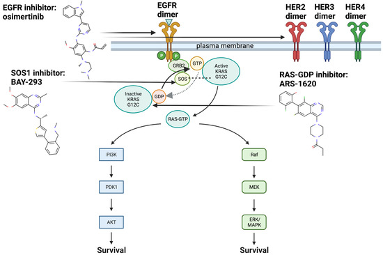 Targeting signaling cascades downstream of KRAS such as RAF-MEK-ERK kinases with MEK inhibitors has also been used to treat KRAS-mutant NSCLC [9]. Unfortunately, this approach yielded limited success due to resistance driven by increased activation of ErbB2 [6,9]. However, treating KRAS G12C cells with second generation EGFR inhibitors in combination with KRAS G12C inhibitors may mediate resistance mechanisms [10]. Specifically, resistance to ARS-1620 was mediated by treatment with the second generation EGFR inhibitor afatinib [10]. Further analysis revealed that this resistance is modulated by EGFR and aurora kinase A (AURK) signaling [10]. The relationship between AURK and EGFR to these resistance mechanisms, and whether third generation EGFR inhibitors such as osimertinib may show similar effects is yet to be determined. Recently, overexpression of HER2 specifically has been shown to cause resistance to KRAS G12C inhibitors such as sotorasib/AMG-510, which can in turn be mediated with SHP2 inhibitors [11].