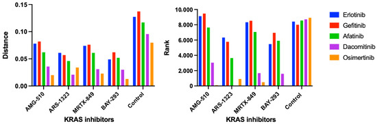KRAS and EGFR inhibitor similarity scores and rankings using the CANDO platform. Following the generation of the compound-proteome interaction signatures for all drugs/compounds in our library, the similarity scores and rankings were calculated between four KRAS inhibitors AMG-510/sotorasib, ARS-1323 (racemate of ARS-1620), MRTX-849/adagrasib, BAY-293, and all other compound signatures. Overall, we found high similarity between our four KRAS inhibitors and EGFR inhibitors erltotinib, gefitinib, afatinib, dacomitinib, and osimertinib using the cosine distance between the interaction signature vectors (Section 3.5). The left panel shows the average similarity scores (vertical axis) for the five first, second, and third generation EGFR inhibitor interaction signatures (colored bars) compared to the signatures of four KRAS inhibitors (horizontal axis). The average similarity scores for each EGFR inhibitor signature compared to those from our entire 13,217 drug/compound library are also shown as a control. The corresponding pairwise signature similarity rankings (vertical axis) are displayed on the right panel. Overall, KRAS G12 inhibitors were predicted to be highly similar to EGFR inhibitors relative to the average drug/compound in our library. Osimertinib, a third generation EGFR inhibitor, was calculated to be the most similar to all the four KRAS inhibitors relative to the other EGFR inhibitors, and was ranked first when compared to BAY-293 relative to the entire compound library. Created with BioRender.com.