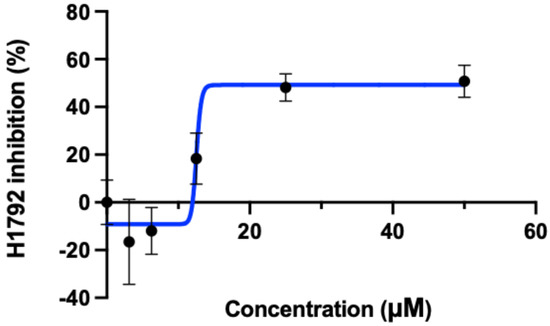 Table 1 shows the two cell lines used for validation. NCI-H1792 used as the experimental cell line as it contains the KRAS G12C mutation, and PC-3 was used as the KRAS wild type/control cell line. H1792 was chosen specifically as it has exhibited resistance to ARS-1620 alone, and therefore is an ideal candidate for testing whether EGFR inhibitors in combination with ARS-1620 may mediate this resistance [35]. As predicted with the aid of CANDO, KRAS G12C inhibitor ARS-1620 combined with osimertinib and pan-KRAS inhibitor BAY-293 combined with osimertinib showed synergistic effects on decreasing cellular viability in H1792. Neither KRAS inhibitor was effective at decreasing cellular proliferation of H1792 alone, so GI50 values could not be determined (Figures S1 and S2). Figure 4 shows the GI50 for osimertinib with the H1792 cell line. We did not observe as strong effects on cellular proliferation with the above combinations of inhibitors when tested on the PC-3 cell line, indicating a decreased effect on KRAS wild type (Figures S3 and S4).There were no significant effects on PC-3 between the untreated control and the treatment conditions with the combination of ARS-1620 and osimertinib. However, the combination of BAY-293 and osimertinib did show a significant increase in inhibition for the highest three treatment conditions, albeit a much smaller increase compared to the effect observed with H1792. We believe this is due to BAY-293 targeting the interaction between WT-KRAS and SOS1, as well as mutant KRAS and SOS1. None of the other EGFR/ERbB inhibitors tested (erlotinib, gefitinib, afatinib, dacomitinib) showed synergy with ARS-1620, or effectiveness in decreasing H1792 cellular proliferation alone.