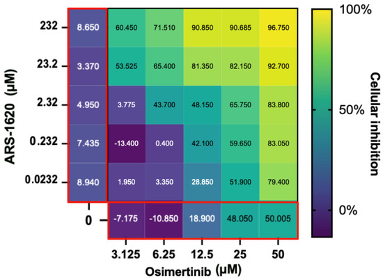 Evaluation of the ARS-1620 and osimertinib drug combination. The main heatmap panel outlined in black shows H1792 cell inhibition as a percentage normalized using untreated controls ranging from 0% (dark blue) to 100% (yellow) for different concentrations. ARS-1620 and osimertinib by themselves are shown on the left and the bottom, respectively, (both outlined in red). This shows that although H1792 did not respond strongly to ARS-1620 alone, a synergistic effect on cellular inhibition was observed when combined with osimertinib as hypothesised from the CANDO predictions. Created with BioRender.com.