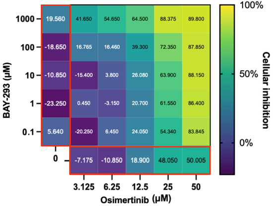 Evaluation of the BAY-293 and osimertinib drug combination. The main heatmap panel outlined in black shows H1792 inhibition as a percentage normalized using untreated controls ranging from 0% (dark blue) to 100% (yellow) for different concentrations. BAY-293 and osimertinib by themselves are on the left and bottom, respectively, (both outlined in red). This shows that although H1792 did not respond strongly to BAY-293 alone, a synergistic effect on cellular inhibition was observed when combined with osimertinib. Created with BioRender.com.