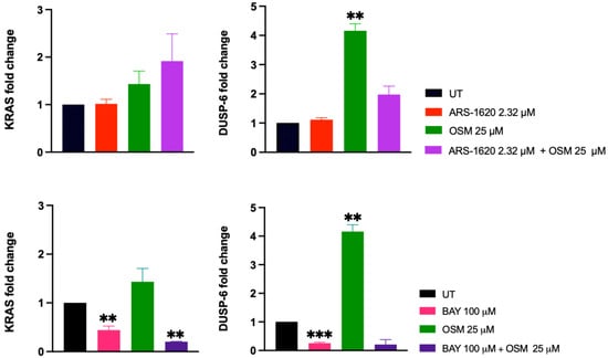 Gene expression analysis of synergistic drug combinations. The top two panels show KRAS and DUSP-6 expression levels upon treatment with ARS-1620, osimertinib, and combination at 24 h; similarly, the bottom two panels show KRAS and DUSP-6 expression levels upon treatment with BAY-293, osimertinib, and combination at 24 h. Treatment with osimertinib significantly increased DUSP-6 expression relative to the untreated control (p < 0.01; **). There were no significant differences between any of the treatment conditions of KRAS expression levels for the ARS-1620 and osimertinib conditions. However, treatment with BAY-293 significantly decreased expression of DUSP-6 compared to the untreated control (p < 0.001; ***). Treatment with BAY-293, and BAY-293 combined with osimertinib, also significantly decreased the expression of KRAS compared to the untreated control, albeit to a lesser extent (p < 0.01). These findings indicate BAY-293 inhibits H1792 proliferation through suppression of MAPK as measured by decreased DUSP-6, while osimertinib and ARS-1620 inhibit proliferation through mechanisms that need to be further elucidated. Created with BioRender.com.