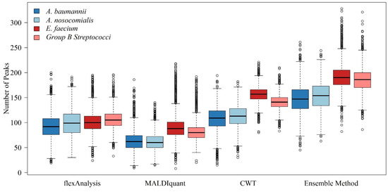 Boxplots of the numbers of peaks with different preprocessing methods for A. baumannii, A. nosocomialis, E. faecium, and Group B Streptococci.
