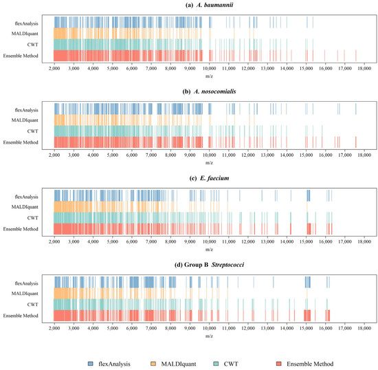Figure 2a shows a plot of the benchmark peak distribution for each preprocessing method for A. nosocomialis. The x-axis was m/z. We listed the m/z values of all benchmark peaks and drew straight lines at these positions to generate a graph to observe the difference in peaks between the different preprocessing methods. Different methods exhibit obvious differences at certain intervals. The combined method integrates all the information. Therefore, the benchmark peaks obtained using the combined method were the highest, and almost covered the peaks of the other methods. A. baumannii, E. faecium, and GBS are shown in Figure 2b–d respectively. The number of benchmark peaks was 679 for A. nosocomialis, 676 for A. baumannii, 657 for E. faecium, and 638 for GBS. These peaks were used to construct machine learning classifiers to identify antibiotic resistance.
