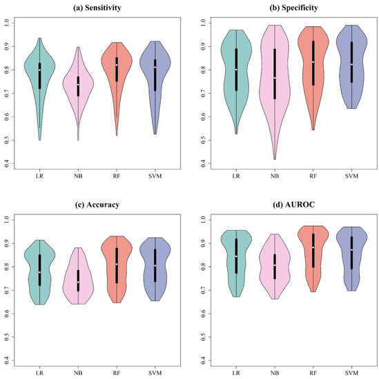 Violin plots for (a) sensitivity, (b) specificity, (c) accuracy, and (d) AUROC using different machine learning classification algorithms. The different preprocessing methods were integrated.