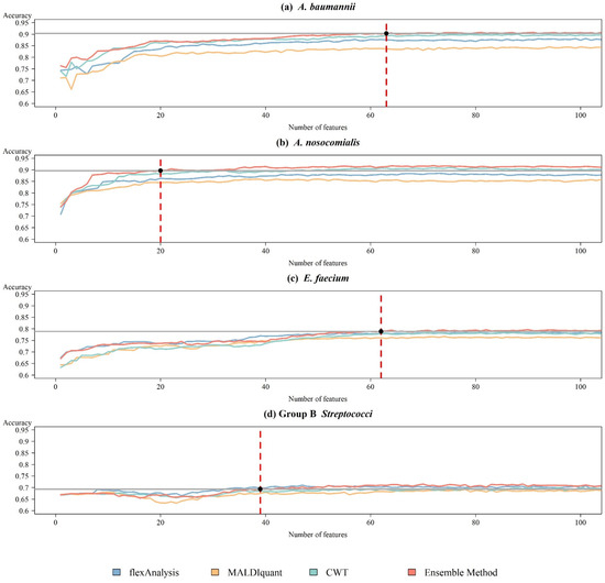 Trend plots of the accuracy using ensemble method preprocessing and RF during the feature selection process on the training datasets for (a) A. baumannii, (b) A. nosocomialis, (c) E. faecium, and (d) Group B Streptococci. The red dotted line indicated the number of features that were selected.