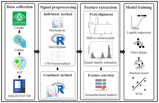 This study was conducted in four parts: data collection, data preprocessing, feature extraction, and model training. Clinical isolates were collected and cultured for species identification and AST. The mass spectra and antibiotic resistance labels of the bacterial isolates were obtained using MALDI-TOF MS and AST, respectively. In signal preprocessing, we considered individual preprocessing methods and combined them to extract informative peaks from the raw mass spectra. In feature extraction, a two-stage alignment method was proposed to deal with the shifting problem of peaks and convert them into available features. Feature selection was performed to identify the important features of antibiotic resistance. In model training, we constructed classification models using various machine learning algorithms. A flowchart of this study is presented in Figure 5.
