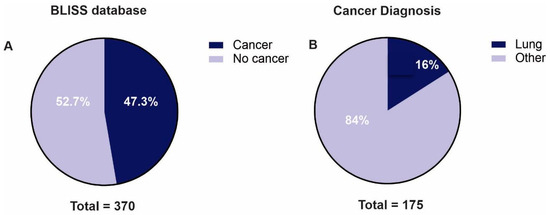 Patients included in the BLISS database: (A) proportion of patients with cancer diagnosis; (B) proportion of lung cancer from all tumors.