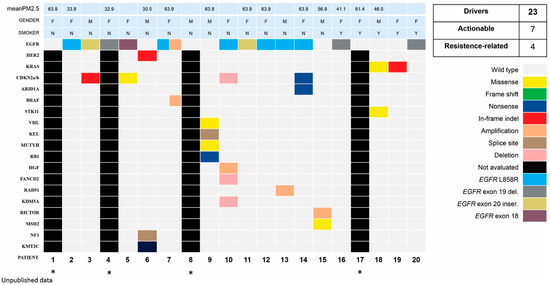 Genomic landscape of lung adenocarcinomas. Genomic profile of the 20 patients submitted to tumoral multigenic next-generation sequencing (NGS) platforms or real-time PCR (rtPCR) for EGFR and ALK. NGS was performed in 16 patients and rtPCR was performed in 4 (indicated by *). Most cases indicated mutations in driver genes. A total of 23 alterations, comprising 7 actionable and 4 related to systemic treatment resistance, were described. In horizontal lines, individual characteristics of the patients are listed, such as average levels of exposure to PM2.5, gender, smoking, and evaluated genes. Each column indicates an individual patient. On the right, the genetic alterations are described and illustrated with colored squares. Abbreviations: del—deletion; indel—insertion or deletion; inser—insertion; PM2.5—particulate matter < 2.5mm of diameter.