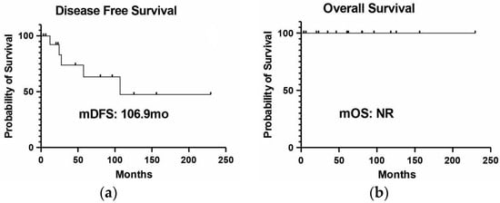 Clinical outcomes of 16 patients with early disease submitted to surgery: (a) median disease-free survival of the sixteen patients assessed; (b) overall survival of these patients. None of them had died due to LC. Abbreviation: NR—not reached.