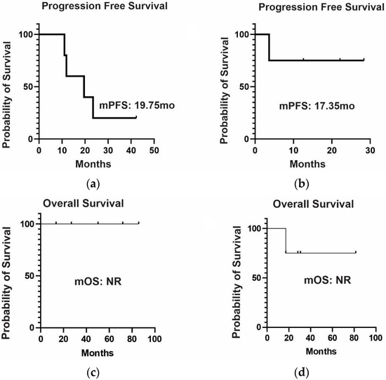 For individuals with advanced disease and EGFR mutations (n = 11), the median progression-free survival was 19.6 and 17.4 months for the first-generation (erlotinib and gefitinib) and third-generation (osimertinib) EGFR inhibitors, respectively, as illustrated in Figure 4a,b. In this context, the median overall survival was not reached, as shown in Figure 4c,d. Notably, one death occurred during osimertinib treatment, coinciding with the emergence of BRAF amplification.