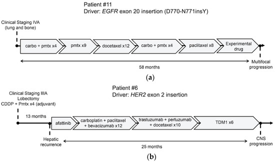 Clinical evolution on systemic treatments of patients #6 and #11: (a) a 41-year-old man with metastatic LC to bone and lungs with EGFR exon 20 insertion was submitted to six lines of treatment with clinical and radiologic benefit until multisystemic progression after seven months of an experimental EGFR oral inhibitor for exon 20 alterations; (b) a 33-year-old man with previous resected LC harboring, HER 2 exon 20 insertion, and submitted to four cycles of platinum doublet experienced a hepatic recurrence 13 months after. Then, he received three lines of systemic treatment, as represented above, with clinical and radiographic benefits for 25 months until CNS progression. Abbreviations: carbo—carboplatin; CDDP—cisplatin; pmtx—pemetrexed; TDM-1—trastuzumab–emtansine; x followed by a number indicates the number of treatment cycles.