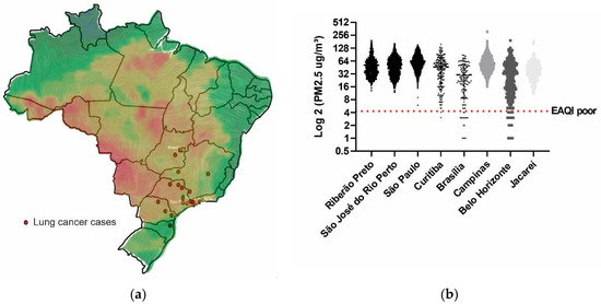 In 2022, the American Cancer Society estimated a total of 236,740 new cases of lung cancer (LC), resulting in 130,180 deaths, accounting for about 25% of all cancer-related deaths [1]. In Brazil, 32,560 new cases were predicted by 2023, and it is the fourth most common malignancy by incidence [2]. Although most cases are sporadic, some cases are caused by external agents such as tobacco smoking, air pollution, and other environmental carcinogens [3]. In the past few years, there has been a growing concern regarding outdoor air pollution as a carcinogen for LC, and its effect may be measured by particulate matter (PM) [4]. The PM2.5 (fine particulate matter with <2.5 µm of diameter) may enter the terminal bronchioles and alveoli, triggering local inflammatory processes [5]. Incidence and mortality from LC with PM2.5 levels have been demonstrated in North America, Asia, and Europe regardless of cigarette smoke exposure [6].