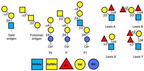 - Keusch, J.J.; Manzella, S.M.; Nyame, K.A.; Cummings, R.D.; Baenziger, J.U. Expression cloning of a new member of the ABO blood group glycosyltransferases, iGb3 synthase, that directs the synthesis of isoglobo-glycosphingolipids. J. Biol. Chem. 2000, 275, 25308–25314. [Google Scholar] [CrossRef]