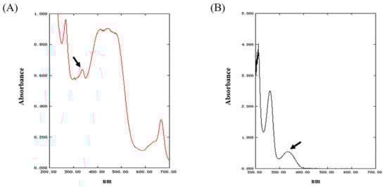 Ultraviolet–visible absorption spectra of MAAs in Phaeodactylum tricornutum ICE-H: (A) absorption spectra of MAAs before purification at 200–700 nm; (B) absorption spectra of MAAs after purification at 200–700 nm. The arrow refers to the absorption peak of the extract at 300–400 nm.