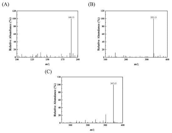 Mass spectral analysis of MAA compounds identified molecular ions m/z 189.13, 333.13, and 347.15 [M + H]+, respectively (Figure 2). The compounds were further analyzed by liquid chromatography-tandem mass spectrometry. According to the results of secondary fragments (Figure 3), the ions of the compound in Figure 3B included m/z 300.10, m/z 274.12, m/z 230.13, and m/z 186.10. The ions of the compound in Figure 3C included m/z 303.12, m/z 288.13, m/z 244.14, m/z 200.12, m/z 186.10, and m/z 136.06. Manyun Chen et al. [] analyzed the MAA components in the heterologous expression products of Escherichia coli, and the fragments of shinorine and porphyra-334 were basically consistent with the main fragments in this experiment. By comparing mass spectra from various reports, it is discovered that m/z 288, m/z 244, m/z 230, m/z 197, m/z 186, and m/z 137 are common molecular ion peaks after MAA compound cleavage [,]. After comparison, the MAA components in Phaeodactylum tricornutum ICE-H were identified to be 4-deoxygadusol (4-DG) (Figure 3A), shinorine (Figure 3B), and porphyra-334 (Figure 3C).