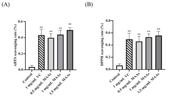 As shown in Figure 4, MAAs could considerably scavenge ABTS and DPPH free radicals when compared to the control group (p < 0.01), and the free radical scavenging ability of MAAs increased with concentration.