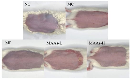 All animal experiments met the requirements of the National Laboratory Animal Ethics Committee of China and were approved by the Animal Care Review Committee (approval number SYXK2020-0422), Qingdao University of Science and Technology, China. After 7 days of adaptive feeding, 30 mice (6–7 weeks) were evenly divided into 5 groups based on body weight, with 6 mice in each: normal group (NC), model group (MC), positive group (MP), MAAs of low- and high-dose groups (MAAs-L, MAAs-H). The back of the mice was depilated with ethanol solution containing Na2S (6%, w/w), and the depilation area was 2 × 2 cm2, followed by adaptive feeding for 3 days. Then, the mice in the MC group were treated with 200 μL distilled water on the back; the MP group was treated with 200 μL VC (1 mg/mL); the MAAs-L group was treated with 200 μL MAAs (2.5 mg/mL); and the MAAs-H group was treated with 200 μL MAAs (5 mg/mL). Dose determination was based on the previous study []. These treatments were repeated twice a day. According to the previous research, the UVB (302–310 nm) intensity was 300 mJ/cm2 []. The NC group received no UV irradiation and only 200 μL of distilled water for 7 days. The body weight of mice was recorded every day, and the skin condition of the mice back was observed. After the last irradiation, the mice were sacrificed after the back state was photographed, and the back skin was collected and preserved at −80 °C or fixed with 4% paraformaldehyde (Sinopharm Chemical Reagent Co., Ltd., Beijing, China) for further analysis.