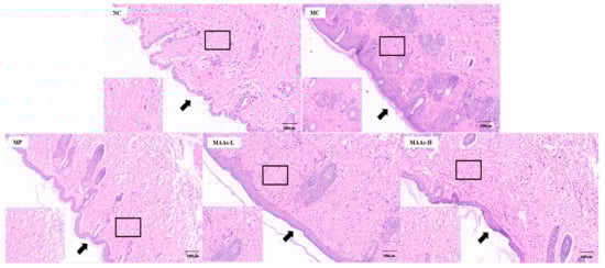 We performed histopathological analysis of skin lesions by hematoxylin−eosin (H&E) staining. The results are shown in Figure 6. The back skin of mice in the NC group without UVB irradiation showed a complete and clear structure. However, the mice in the MC group irradiated by UVB showed obvious thickening of the epidermis. Compared with the NC group, the skin of the MP group and MAA group also showed epidermal thickening, but the degree of thickening was significantly smaller.