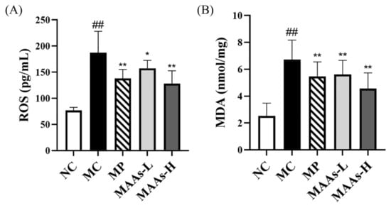 Effects of MAAs on ROS generation (A) and MDA levels (B) in UVB-induced mice skin. ROS, reactive oxygen species; MDA, malondialdehyde. NC represents the normal group, MC represents the model group, MP represents the positive group, MAAs-L represents the low-dose MAA group, MAAs-H represents the high-dose MAA group. The data are denoted as the mean ± SD from triplicate results. (## p < 0.01, compared with the NC group; * p < 0.05, ** p < 0.01, compared with the model group).