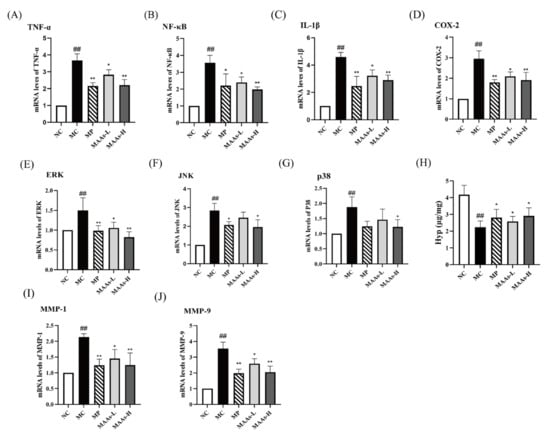 The effects of MAAs on the mRNA levels of inflammation and skin degradation-related genes and the content of hydroxyproline (Hyp) in skin tissue: (A–D) mRNA expression of TNF-α, NF-κB, IL-1β, and COX-2; (E–G) mRNA expression of ERK, JNK, and p38 kinase; (H) the content of Hyp; (I,J) mRNA expression of MMP-1 and MMP-9 (## p < 0.01, compared with the NC group; * p < 0.05, ** p < 0.01, compared with the model group). NC represents the normal group, MC represents the model group, MP represents the positive group, MAAs-L represents the low-dose MAA group and MAAs-H represents the high-dose MAA group. NF-κB, nuclear factor-κB; COX-2, cyclooxygenase-2; TNF-α, tumor necrosis factor-α; IL-1, interleukin 1; MMP-1, matrix metalloproteinases-1; ERK, signal-regulated kinase; JNK, c-Jun amino-terminal kinase.