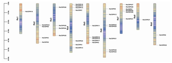 The chromosome location information of the 37 RsCDPK genes was visualized using TBtools software (v1.1041) (Figure 1). RsCDPK genes were dispersed on all R. sativus chromosomes. Approximately 68% of RsCDPK genes were predominantly located on Rs6 (7), Rs4 (7), Rs7 (6), and Rs5 (5), whereas only one RsCDPK gene was found on chromosomes 1 and 8. The number of CDPK genes identified in Arabidopsis (34) [9] and Brassica rapa (49) [37] indicates no correlation between changes in genome size and the number of CDPK gene family members [10].