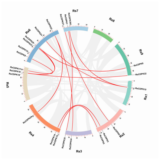 Genome collinearity analysis of RsCDPK genes. Gray lines depict all syntenic blocks in the nine chromosomes of radish. Red lines indicate the segmental duplication of RsCDPK genes.