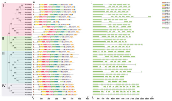 Phylogenetic tree, conserved motif distribution, and gene structure of RsCDPK genes. (A) The phylogenetic tree of RsCDPK proteins was constructed using MEGA 7 by the neighbor-joining method with 1000 bootstrap values and variable color backgrounds for different clades. (B) Conserved motif distributions of RsCDPK members. (C) Exons are represented by green boxes and introns by black lines. The size of the RsCDPK members is indicated at the bottom.