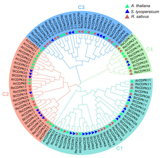 Unrooted phylogenetic tree of RsCDPK genes from Arabidopsis, radish, and tomato. Multiple sequence alignments of RsCDPK members were performed using the muscle method. The resulting aligned sequences were used to construct a phylogenetic tree in MEGA 7 using the neighbor-joining method with 1000 bootstrap replicates. The four subfamilies are highlighted in different colors. RsCDPK proteins are represented as follows: Arabidopsis thaliana, solid green triangles; Raphanus sativus, solid brown triangles; Solanum lycopersicum, solid blue triangles.