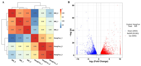 Analysis of Pearson correlation and differentially expressed genes in RNA-seq data. (A) Pearson correlation analysis of three non-cracking plant fleshy taproot cortices (HongYun_1, HongYun_2, and HongYun_3) and three cracking fleshy taproot cortices (505_1, 505_2, and 505_3). Pearson’s correlation coefficient values > 0.8 indicate that the correlation between samples is high. Based on the K-means method, the expression correlation between samples was clustered. p-value > 0.05. (B) Volcano map of differentially expressed genes. The abscissa is log2 (fold change), indicating the expression fold difference, and the ordinate is -log(P), indicating the significant gene expression results. The two vertical dashed lines in abscissa are two times the expression difference threshold; the horizontal dotted line in ordinate is p-value = 0.05 threshold. Red dots represent upregulated genes, blue dots represent downregulated genes, and gray dots represent non-significant differentially expressed genes.