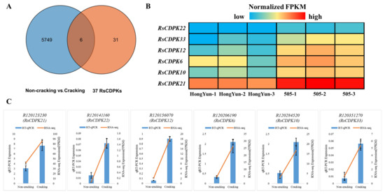 To explore the regulatory role of CDPK family genes in the development of radish roots, we retrieved CDPK gene members in the DEGs from transcriptome data. Venn diagram analysis showed that six RsCDPK genes were present in both the 5755 DEGs and 37 RsCDPK members (Figure 7A). The expression patterns of the six RsCDPK genes are shown in a heatmap (Figure 7B). Notably, all these genes were upregulated in the cracking-susceptible variety. To validate these expression patterns, the levels of the six RsCDPK genes were assessed using RT-qPCR (Figure 7C, Table S5). The RT-qPCR results corroborated the RNA-seq data, thereby confirming the accuracy of the transcriptome data.