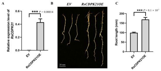 To generate the overexpression construct of RsCDPK21, the coding sequence of RsCDPK21 was amplified via PCR using Phanta Max Super-Fidelity DNA polymerase (Vazyme) from “505” and inserted into the binary vector pMDC83 directly under the control of the CaMV 35S promoter sequence using BamHI and KpnI, which makes use of the ClonExpress II One Step Cloning Kit (Vazyme). The recombinant vector was introduced into Agrobacterium rhizogenes strain K599 (Weidibio, Anhui, China) and used to transform Williams 82 (a transgenic acceptor soybean cultivar). Soybean hairy root transformation was performed as previously described [68,69]. Root length was measured using a vernier caliper. GmELF1b was used as the internal control. All statistical analyses were carried out with the Prism software (GraphPad) like Row mean with SD or SEM. The data were analyzed with the LSD test, using SPSS software 18.0 (SPSS Inc., Chicago, IL, USA). Statistically significant differences (Student’s t-test) are indicated as follows: **, p < 0.01; ***, p < 0.001. GraphPad Prism software (GraphPad) was used for data processing and image visualization. The primer sequences for all genes can be found in Supplementary Table S8.