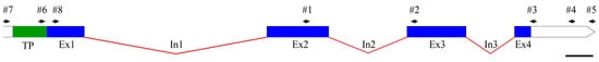 Exon–intron structure of PsbS gene. The transit peptide (TP) encoding region, exons (Ex#) and introns (In#) are marked in green, blue, and red, respectively. The arrows indicate the positions of primer #1–#8 used in the work (see Table 1). The scale bar is 100 bp.