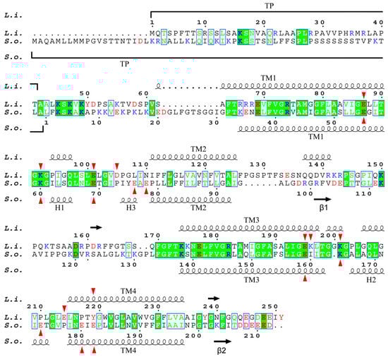 Alignment of L. incisa–PsbS (marked as L.i.) and S. oleracea–PsbS (S.o.) mature protein sequences. For S. oleracea–PsbS, the conventional numbering of AA residues is given (starting from the first residue of mature protein); for L. incisa–PsbS, numbering includes predicted transit peptide (TP). Highly conservative sites are marked with a green background; green letters indicate AA residues similar in physico-chemical properties. Protonatable residues are marked in red (anionogenic AA: Asp, Glu, and Tyr) or blue (cationogenic AA: Lys and Arg). Red arrows mark lumen-exposed glutamate residues of both proteins, as well as aspartate and lysine residues of L. incisa–PsbS. The secondary structure, including α-helices (wavy lines) and β-sheets (arrows), of both proteins is also shown.