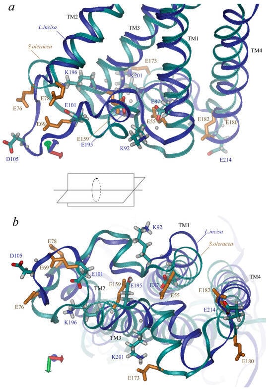 Three-dimensional structure of PsbS lumen-exposed region. Views along membrane (a) and from lumenal side (b) are presented. Along with backbones (marked in blue for L. incisa and in cyan for Spinacia oleracea), the sidechains of ionic residues are shown (in cyan-grey-red for L. incisa and in monotonous orange for S. oleracea, only glutamate residues). Four transmembrane helices (TM1–TM4) are indicated.